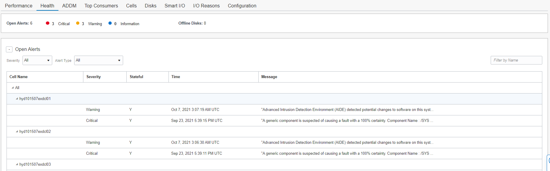 Figure 6: Health section of the Exadata tab of Performance Hub