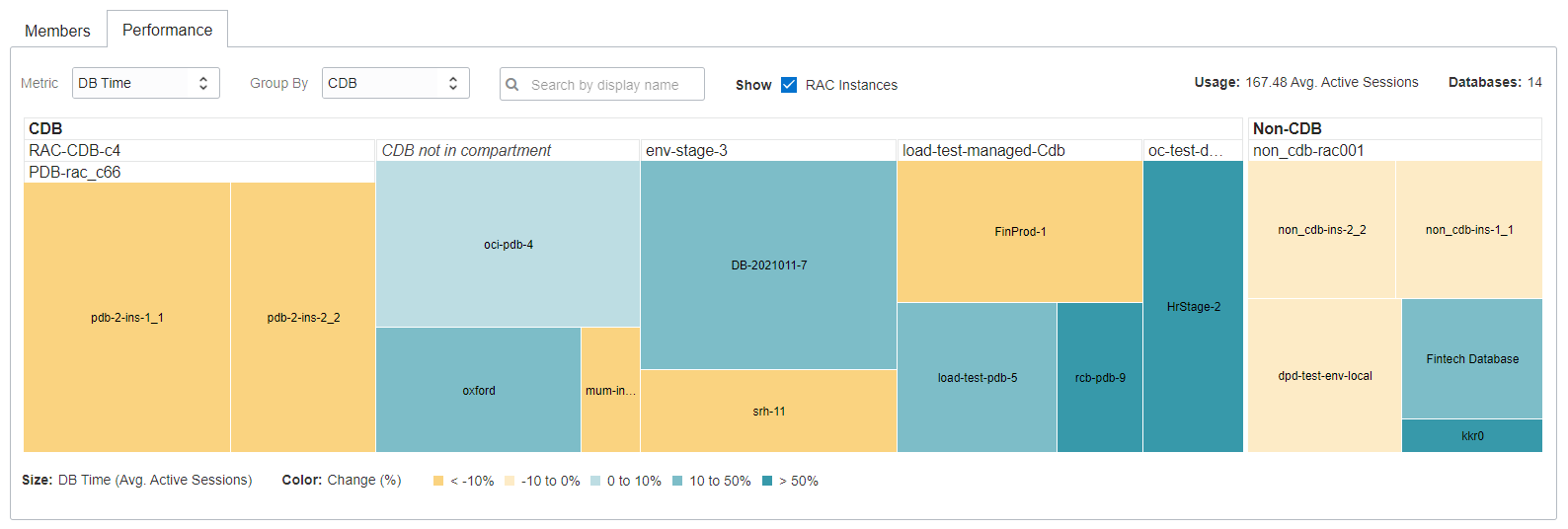 The critical compute resources in a cluster database are CPU and memory. The RAC-aware fleet dashboard in Database Management helps the database administrator identify databases contending for these critical resources. You can select the RAC instance check box in the performance load map view of the fleet dashboard page to display the available performance data for the fleet of clustered database instances within or across compartments.