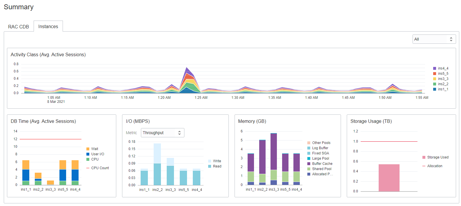You can monitor database instance-specific details from the Instances tab of the Database Summary page to monitor the following metrics: