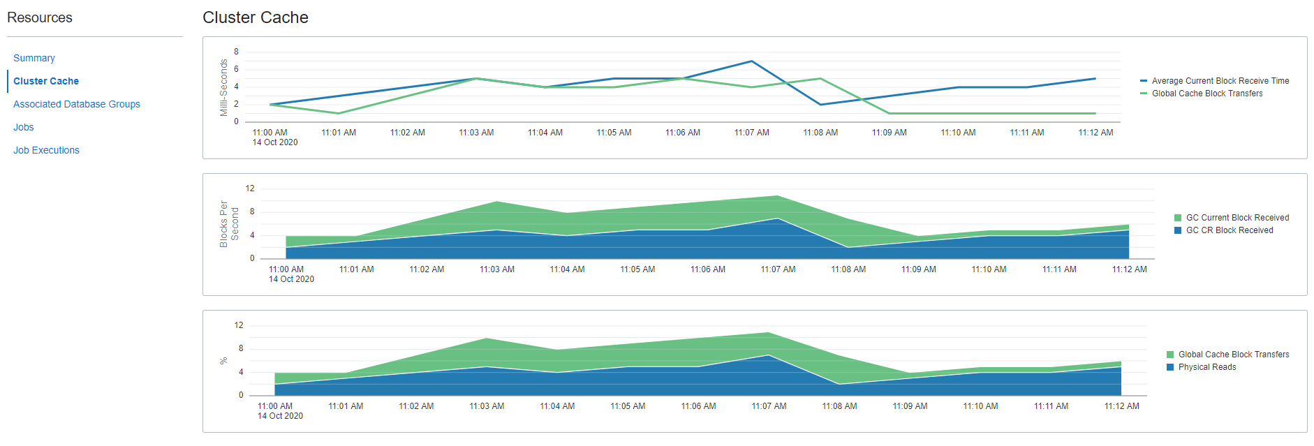 You can monitor the interconnect traffic and RAC cluster wait events on the Cluster Cache page from the Resources section of the managed database details page.