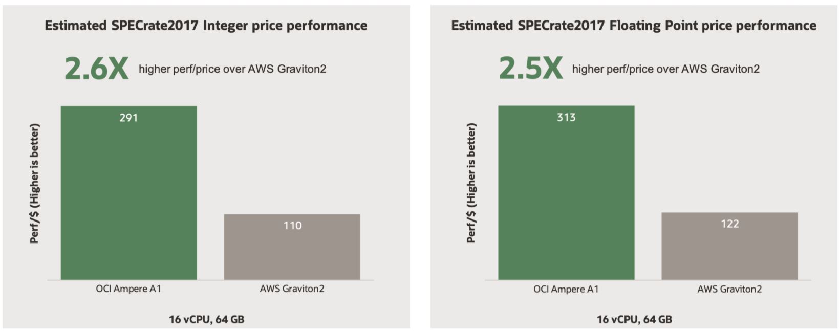 OCI’s Ampere A1 platform is the price-performance leader in the cloud. Based on industry-standard SPECrate2017 benchmarks, Ampere A1 provides an estimated 2.5x better price performance of comparable Arm-based server instances and estimated 4x or higher price-performance than comparable x86-based Intel Skylake or AMD Naples instances.