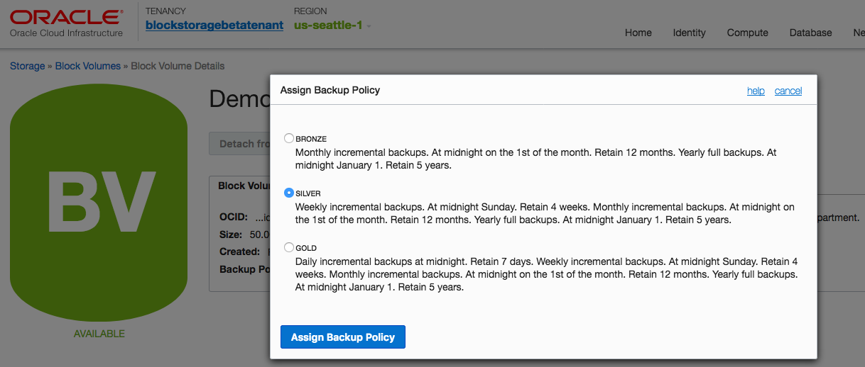 The on-demand, one-off block volume backups are still available, and are now extended with a choice of incremental versus full backup options. As before, with a few clicks, you can continue to perform an on-demand one-off backup, and also select whether to backup only the data that has changed since the last backup (incremental) or the entire data that has changed since the time you created the volume (full).
