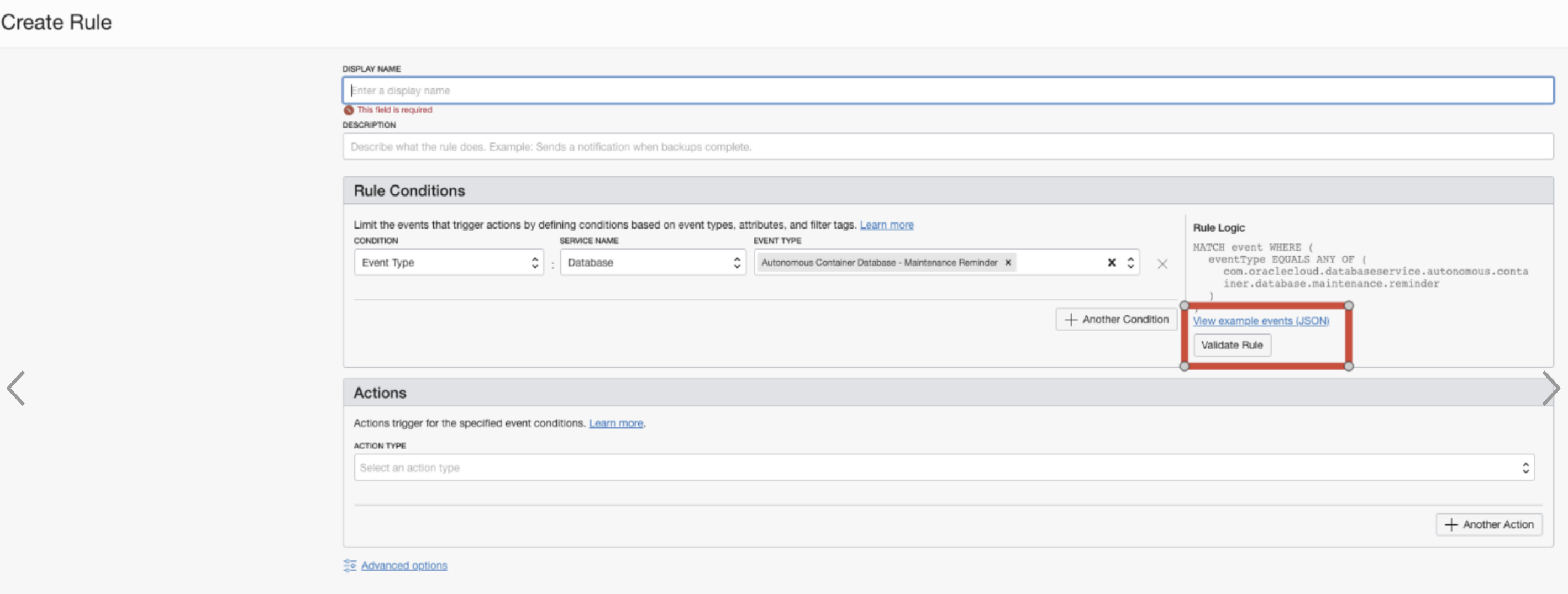 We have to select the right event type and conditions for creating the event rule. In the condition, we choose the OCID value of the Autonomous Transaction Processing database that we want to create an event for, as resource ID. In the Action drop-down, choose the option of Notification.