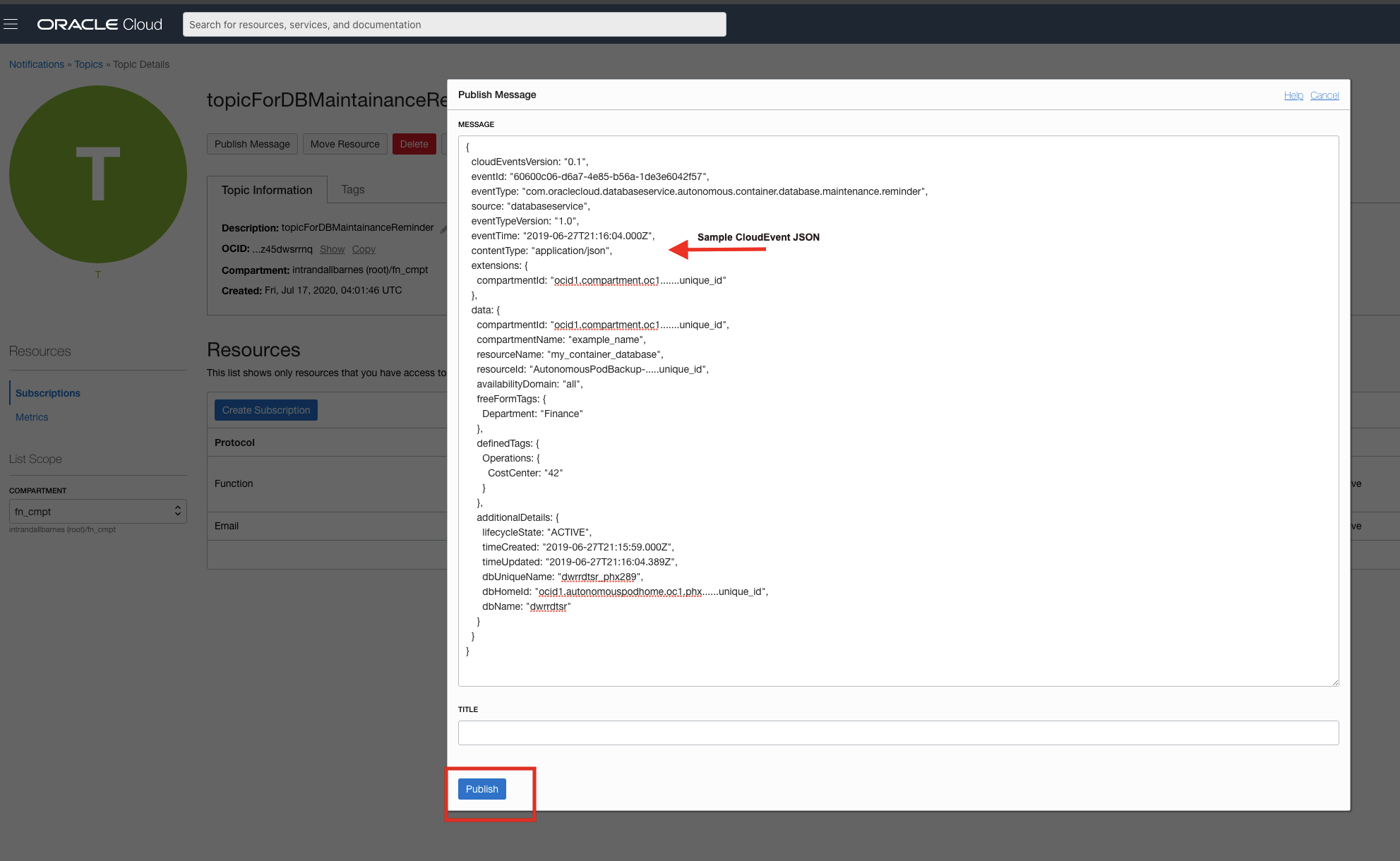 Note the Publish Message button. We can easily test and debug our Notification+Function integration from the Console. We already have the sample CloudEvent JSON. We can publish the message to this topic, for this sample JSON.