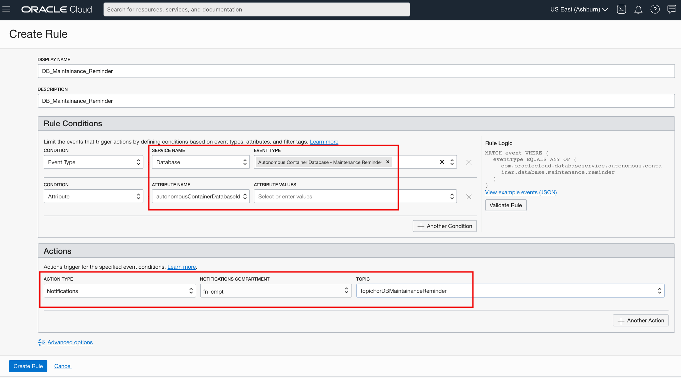 Figure 7: Event Rule Creation with Notification Topic As Its Action