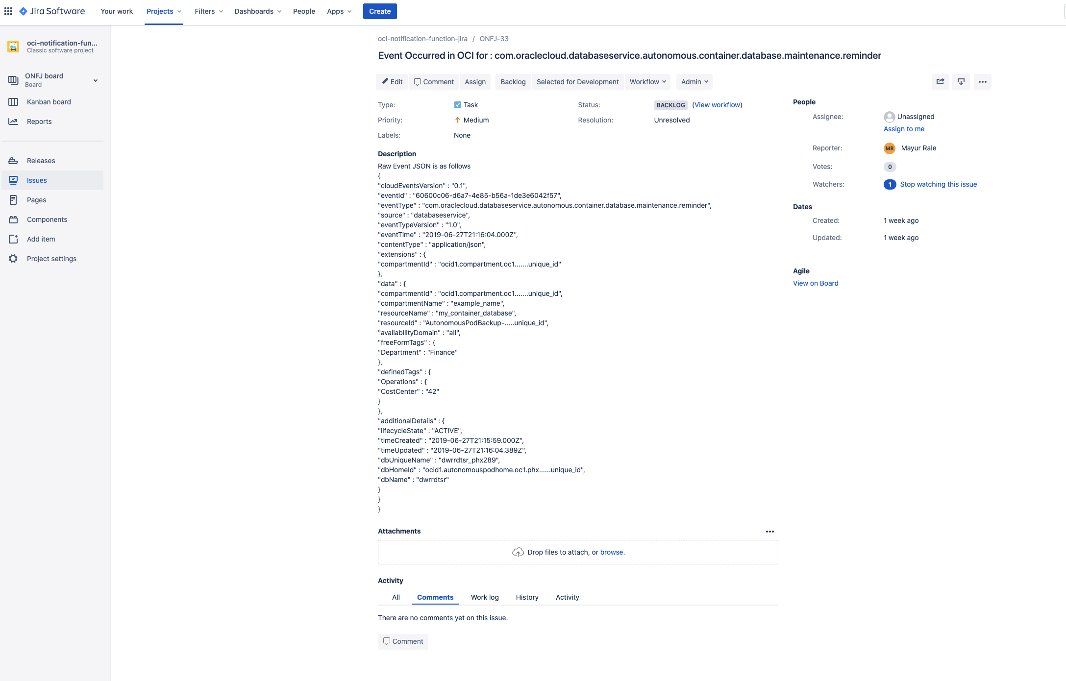 In this blog, I show you how to automatically file a Jira ticket for an event or alert in Oracle Cloud Infrastructure using Oracle Functions and by calling the Jira API directly from the Functions code.