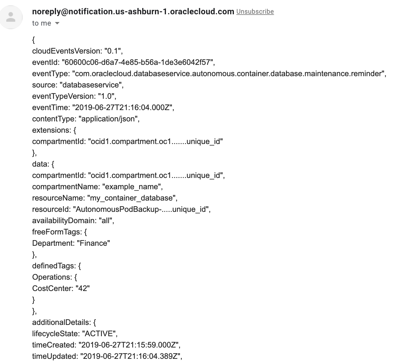 2. This notification has the function and an email as its two subscriptions. Whenever the Autonomous Transaction Processing Maintenance Reminder event occurs, it triggers the notification with CloudEvent JSON (CNCF compliant and open) as an input data to it. Notification then fans it out to all its subscriptions.
