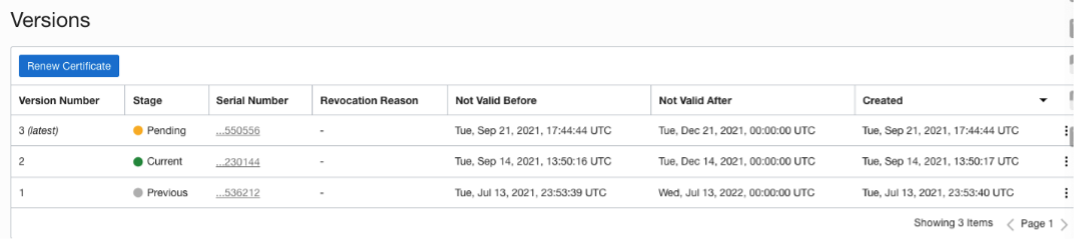 OCI Certificates will keep track of up to ten versions of your certificates. You can easily tell which certificate is in use by the stage column in the versions field. The active certificate will be in the current stage. Older versions will be in the previous stage. If you just manually renewed the certificate, but the certificate has not be deployed to a resource automatically, then the certificate will be in the pending stage.