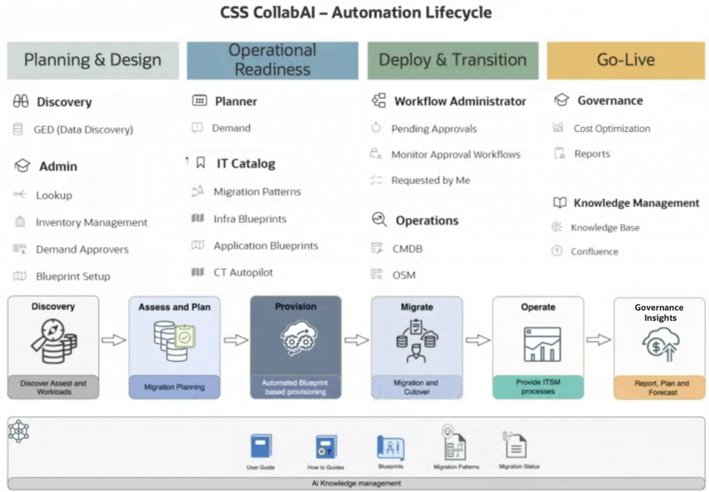 While CollabAI provides a unified, modular platform for the entire migration and operations journey, tailored for customer-specific regions and featuring robust automation from discovery through Governance Insights, Oracle CSS also offers Cloud Success Navigator as an alternative or complement for select scenarios.