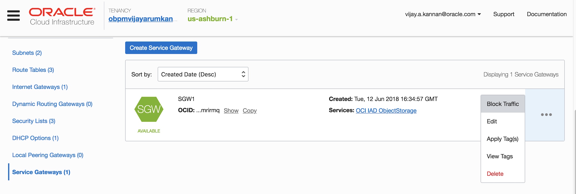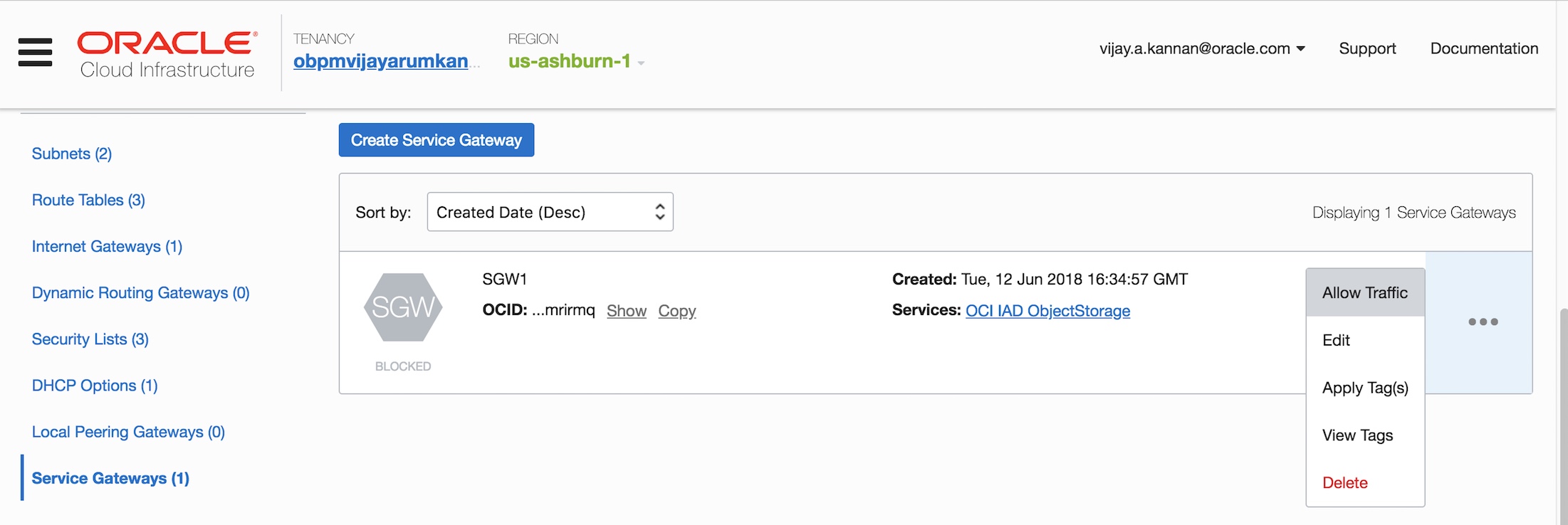 - You can block or allow traffic through the service gateway. Blocking the service gateway prevents all traffic regardless of any existing route rules or security lists in your VCN. This flexibility provides administrative-level control at a single point in the network without having to update security or route rules at different subnets.