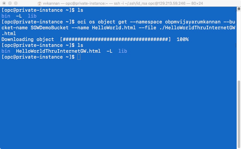 - You have now removed the dependency on the NAT instance and internet gateway for Object Storage access. The Object Storage bucket is now accessible from the instance in the private subnet through the service gateway.