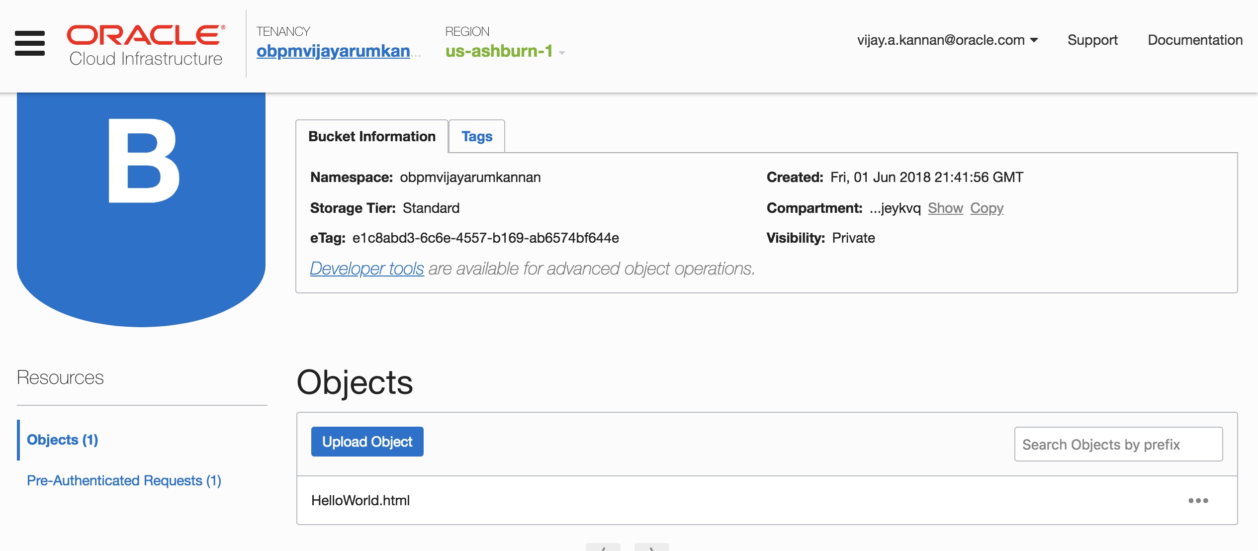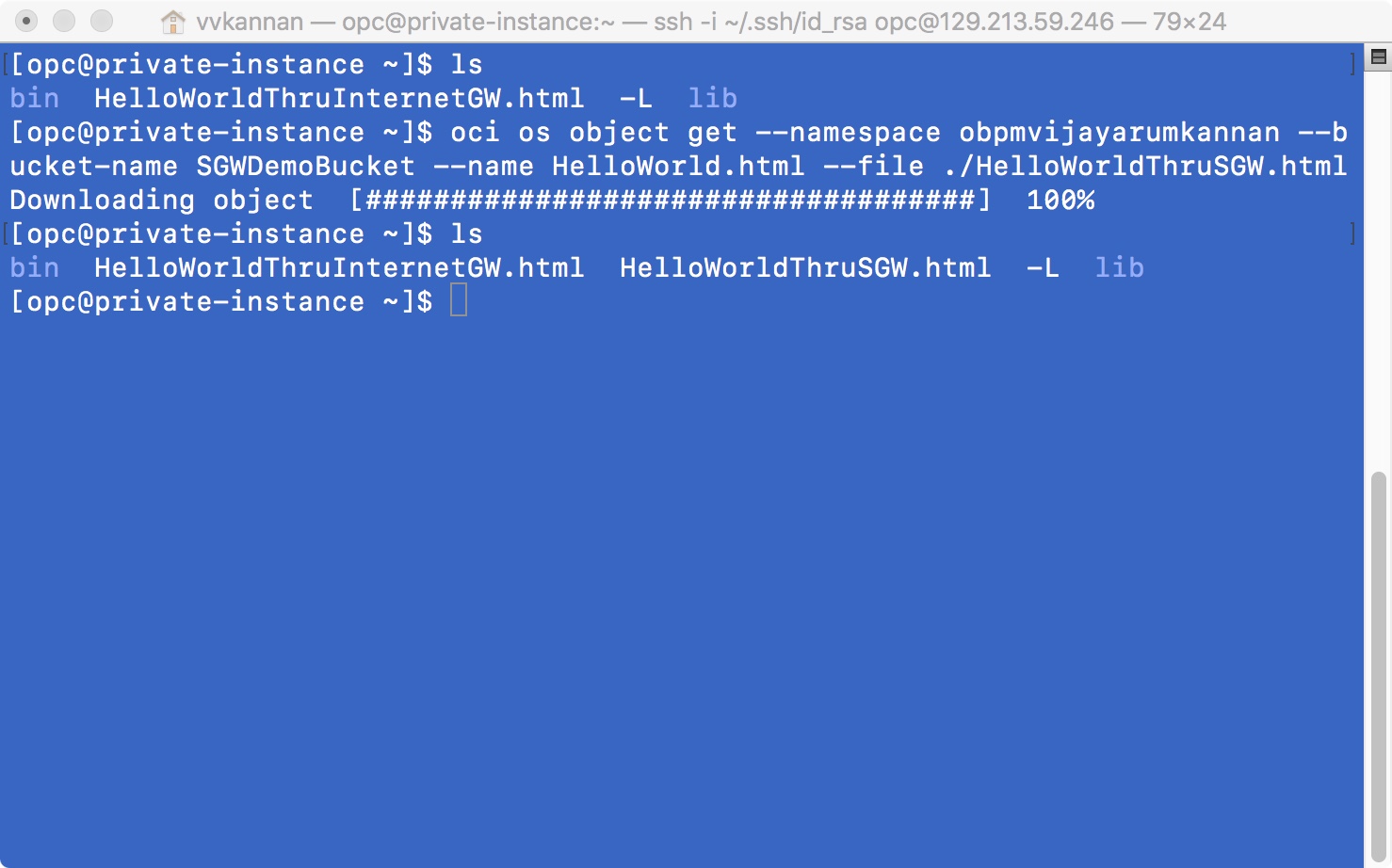 - You can use the Oracle Cloud Infrastructure Command Line Interface (CLI) to access the Object Storage bucket from the instances. The bucket is accessible from the instance in the private subnet through the NAT instance and the internet gateway.