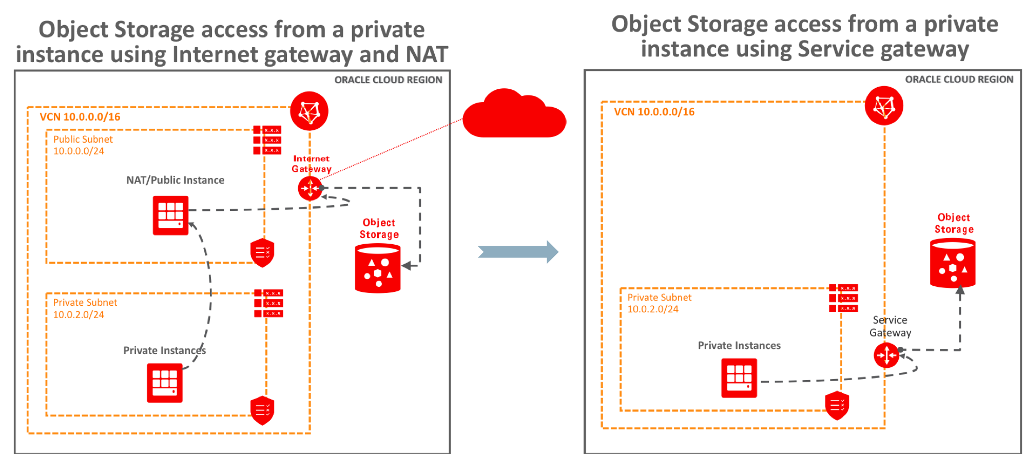 You might have a private instance in your VCN that accesses the Object Storage bucket through a NAT instance and internet gateway. This section walks through that scenario and an example in which you enable the same private instance to access the same bucket privately and securely through a service gateway.