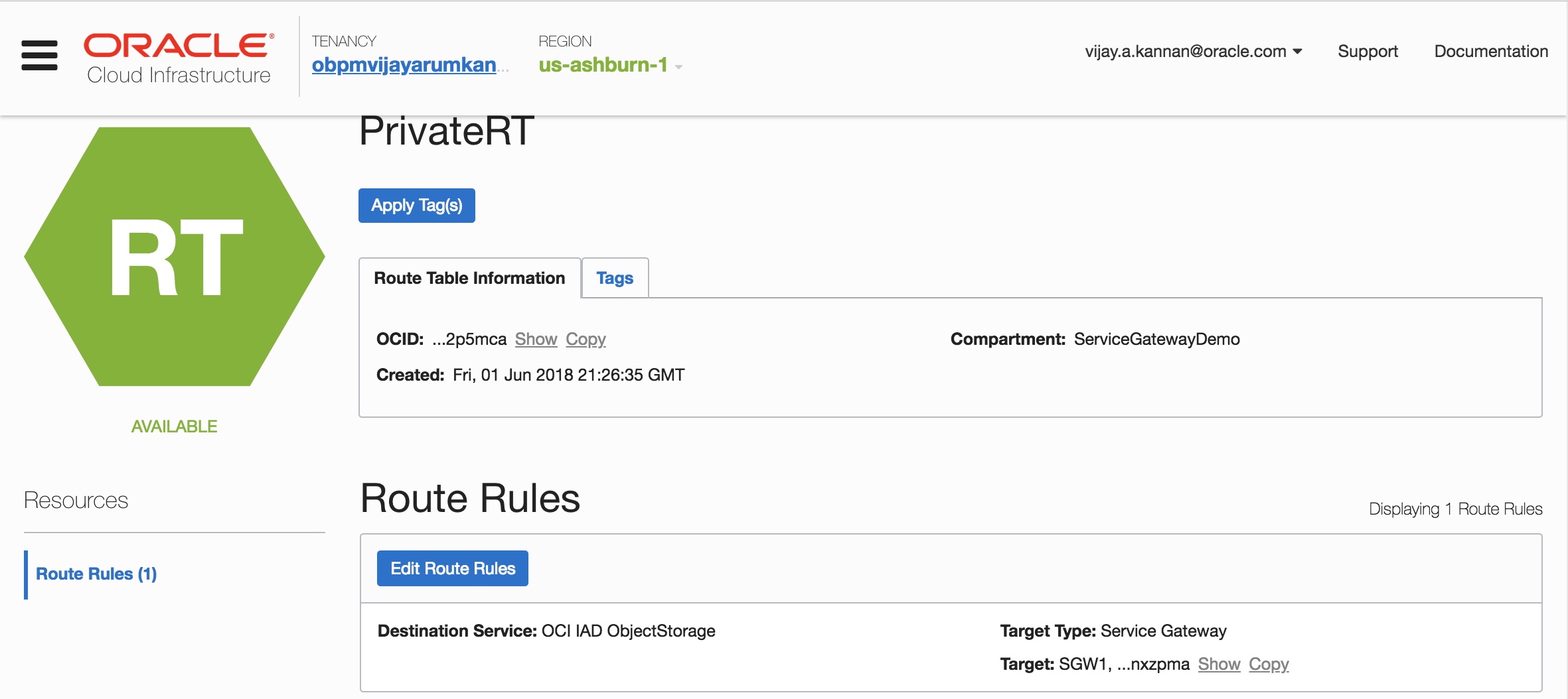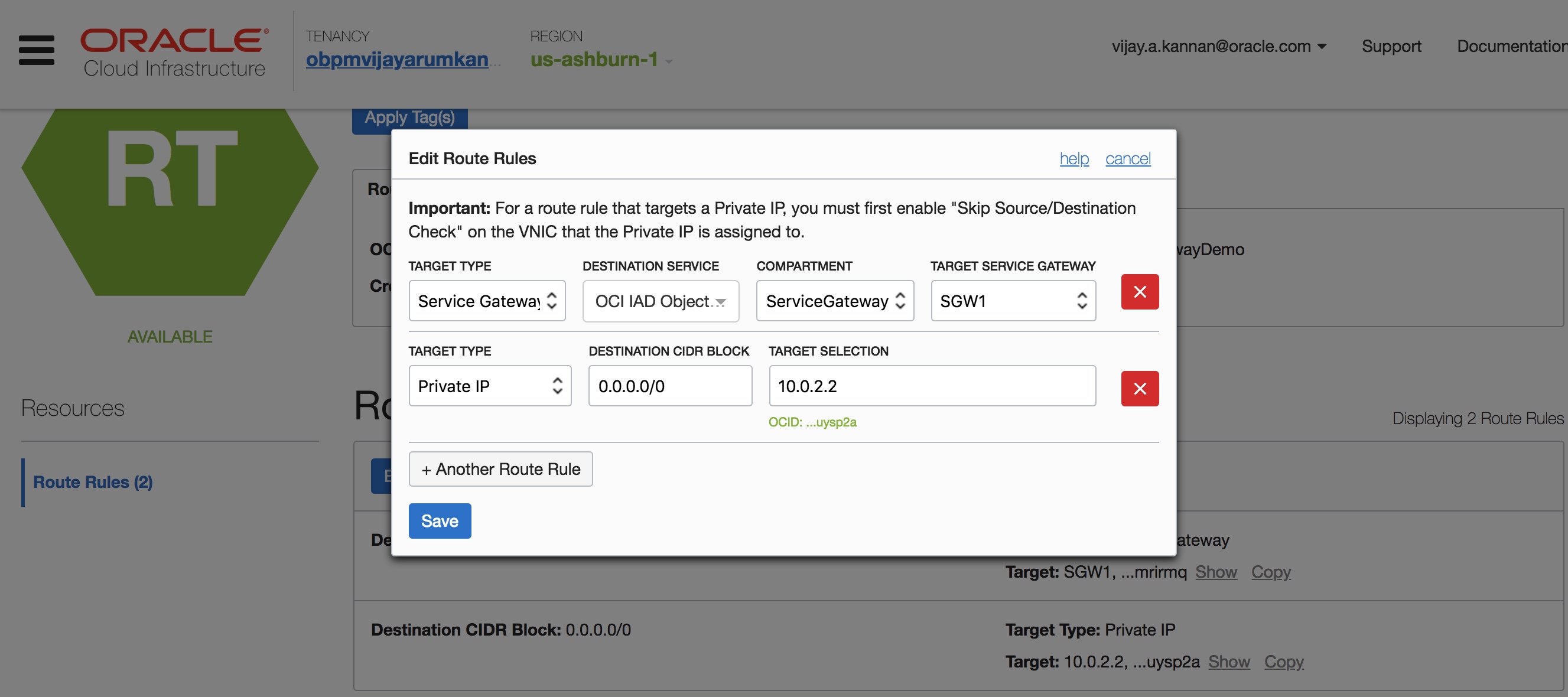 Note: With the launch of service gateway, we have now introduced Service CIDR labels, that can be used in place of a CIDR block in the route rules and/or security rules. This label maps to all IP addresses of the service within the regions. You don’t have to know the specific CIDR blocks for the service’s public endpoints, which could change over time. As you can see from the image above, you can now choose Service Gateway as the Target Type and provide the label of the OCI Object Storage Service.