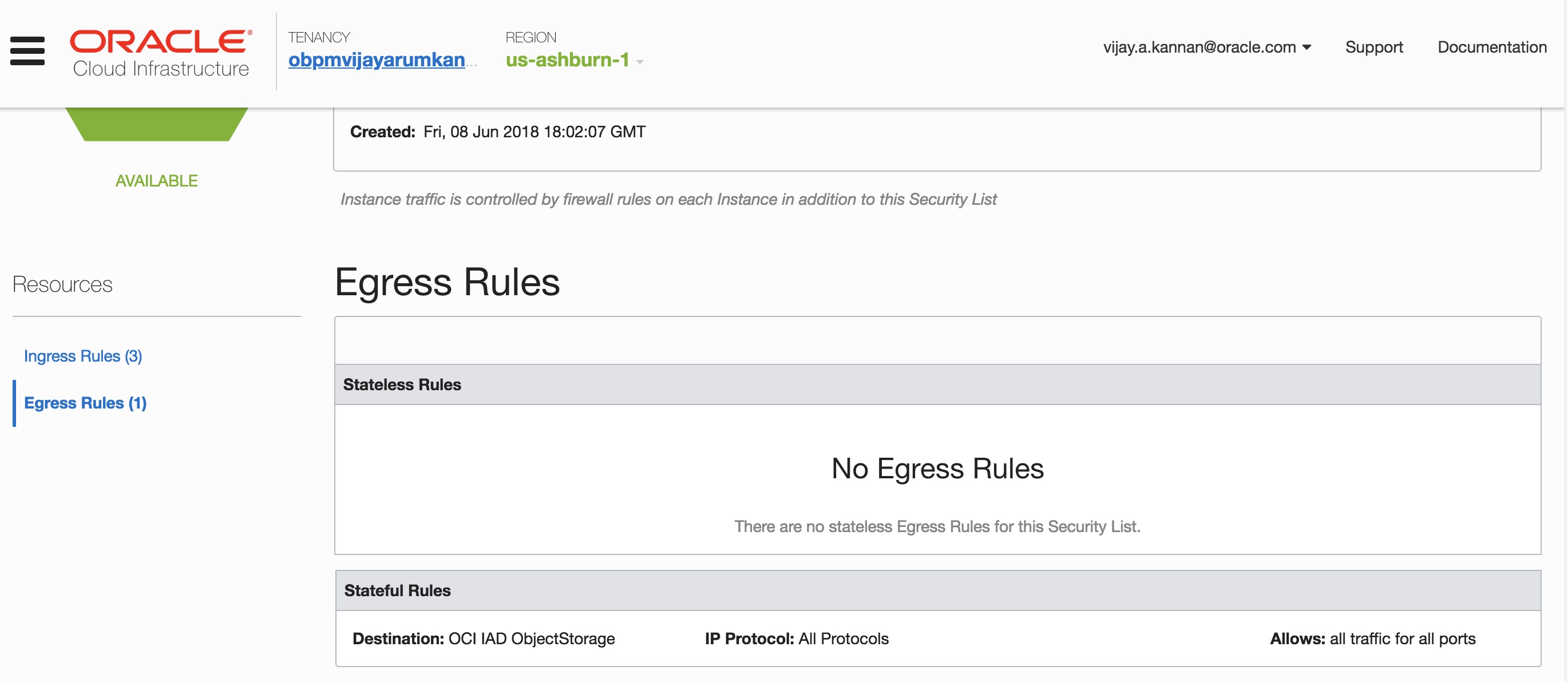 - You may choose to secure your private instance optionally by setting up egress security rules in the subnet’s security list for the traffic to the Object Storage service. As with route rules, you can specify the Object Storage service as the destination service in the security rule.