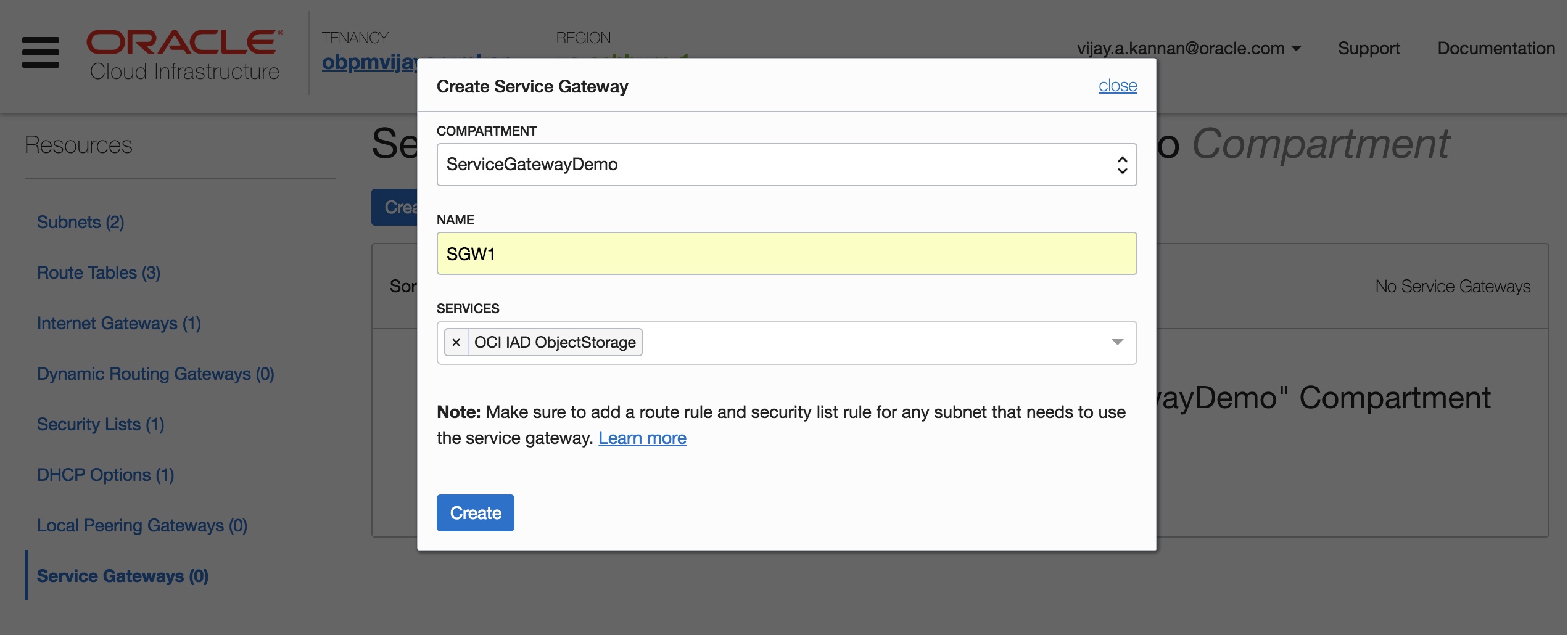 Now create a service gateway in the VCN and enable private connectivity between the private subnet and the Object Storage endpoint.