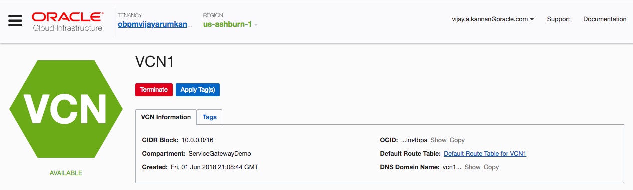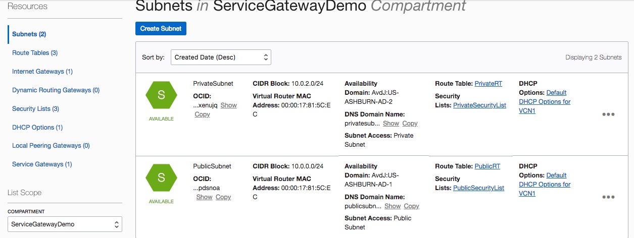 - Your VCN has one public subnet and private subnet with their associated route tables, security lists, and DHCP options created based on steps 1-3 described in this blog post.