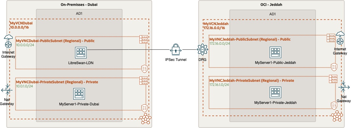The idea of the post is to have two regions, one simulating On-Premises environment and the other Oracle Cloud Infrastructure, the article is going to provide a step-by-step procedure in order to achieve the goal of connecting both sides using LibreSwan.