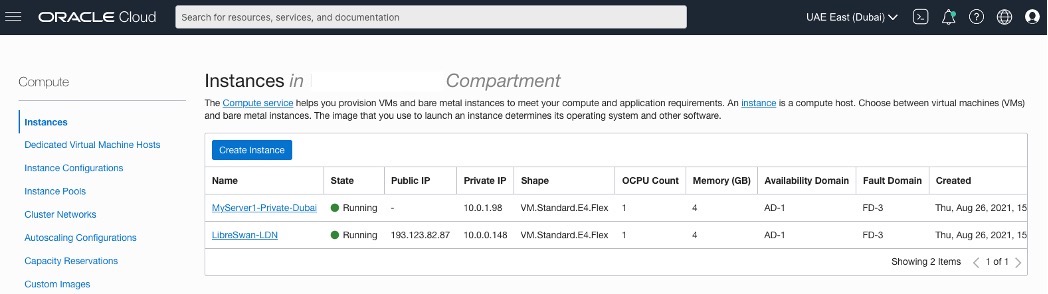 Lauching two Compute Instances in the OCI – Uast Dubai – On-Premises region, one in each subnet