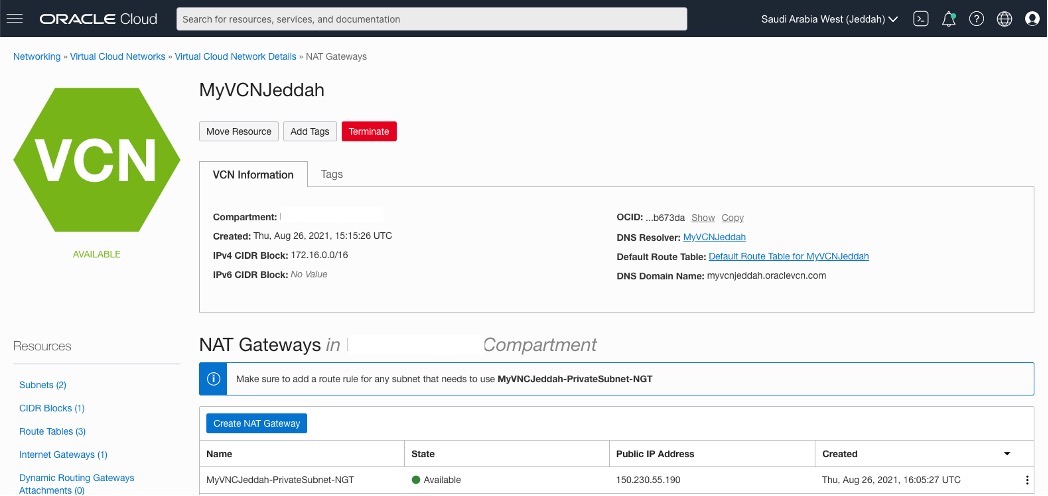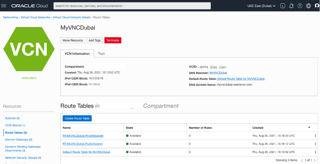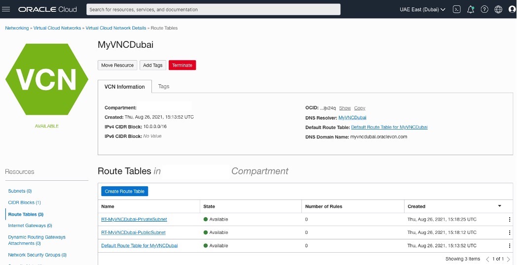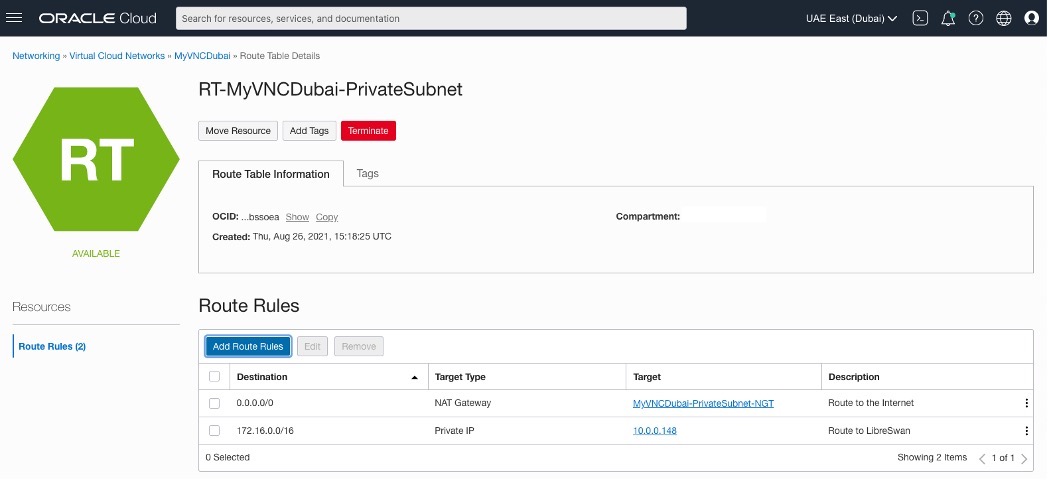 Adding Route Rules for RT-MyVNCDubai-PrivateSubnet and RT-MyVNCJeddah-PrivateSubnet
