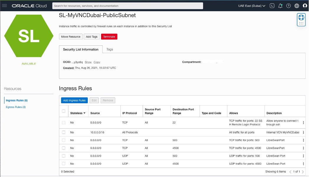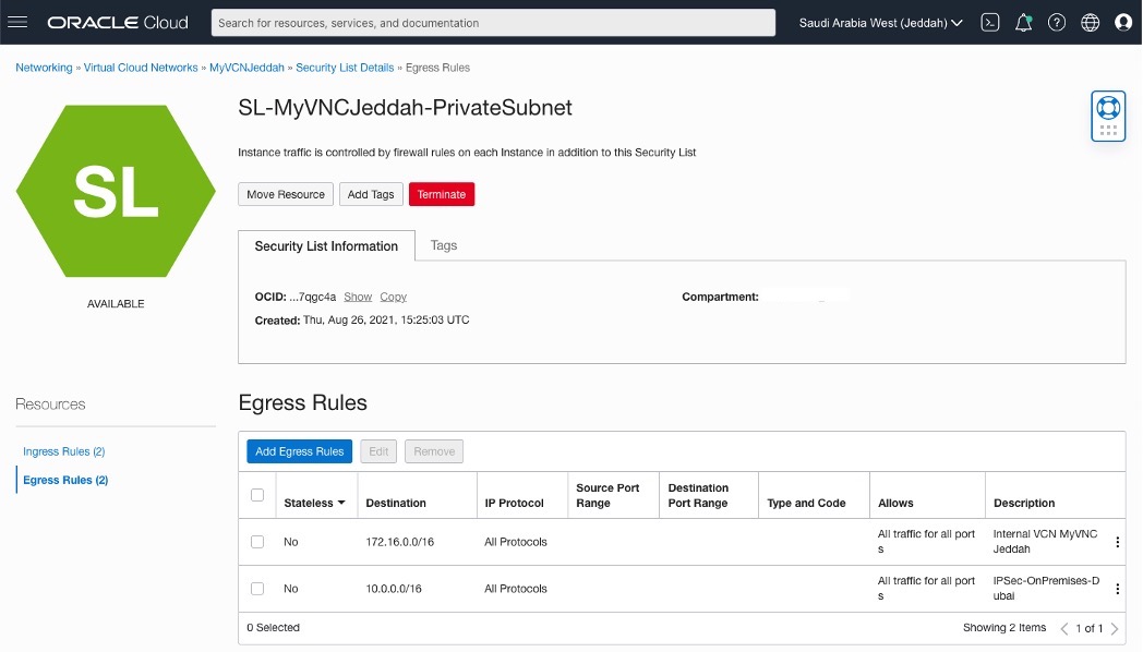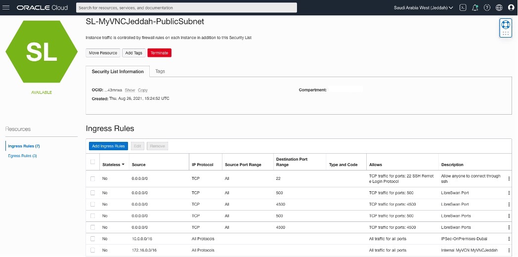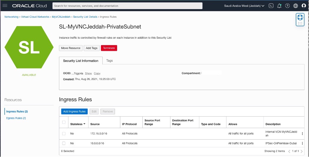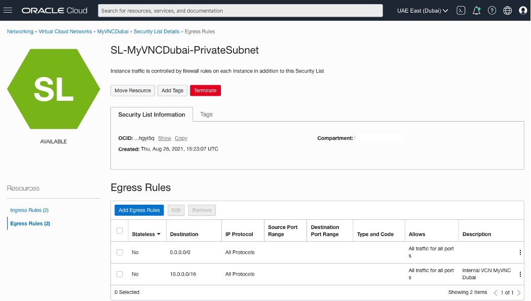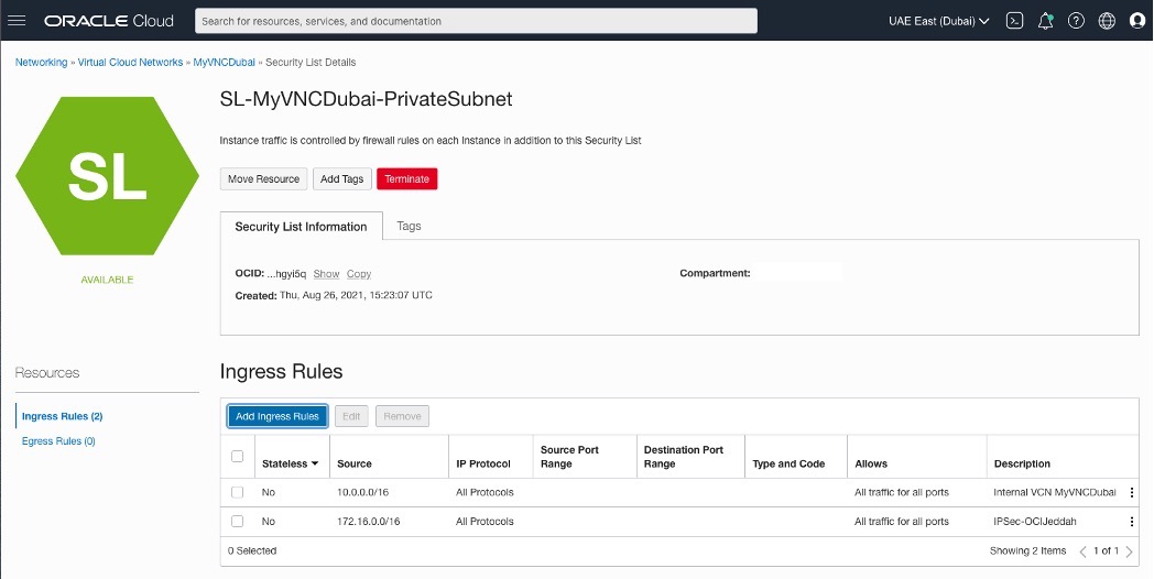 OCI – Uast Dubai – On-Premises – One to handle public subnet and the other one to private subnet with no rules now.