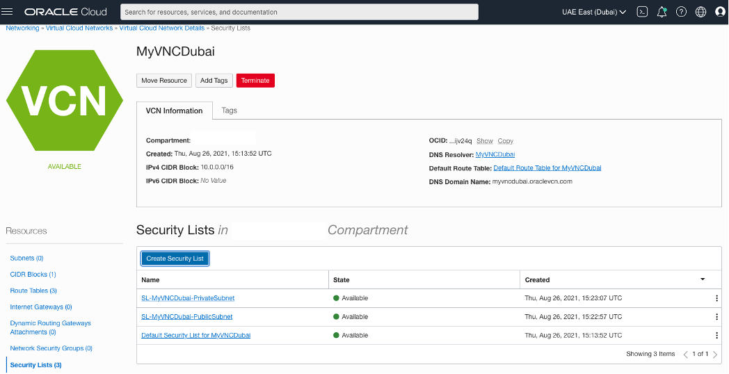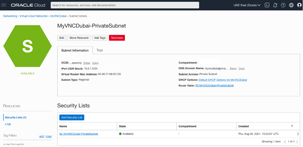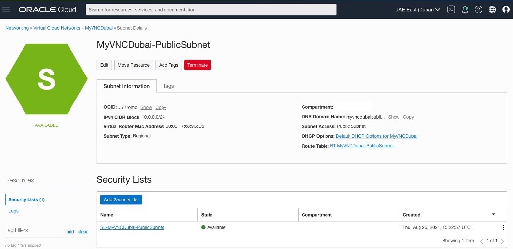 OCI – Uast Dubai – On-Premises – One security list for each subnet.