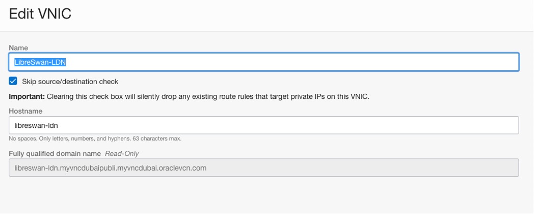 Enabling the option “Skip source/destination check” on the LibreSwan-LDN compute instance – OCI – Uast Dubai – On-Premises region.