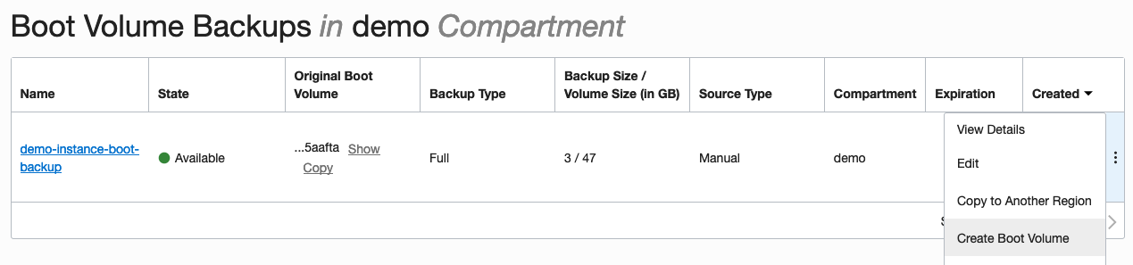 5. From the actions menu (three dots) for the backup in the destination region, select Create Boot Volume.
