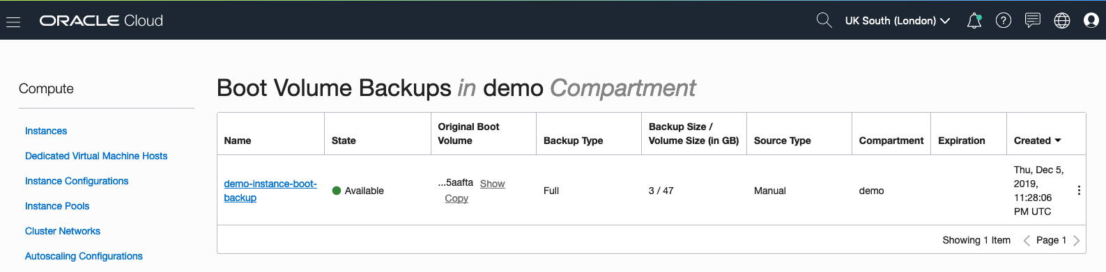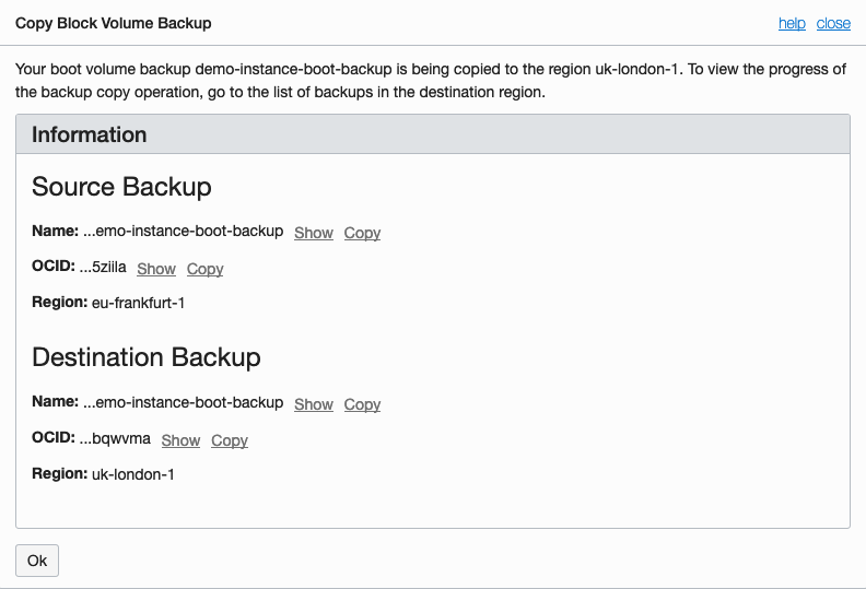 Copying a boot volume backup to another region is straightforward in the Oracle Cloud Infrastructure Console. The following steps show how to copy a backup across regions and how to restore volume content from a backup in another region.