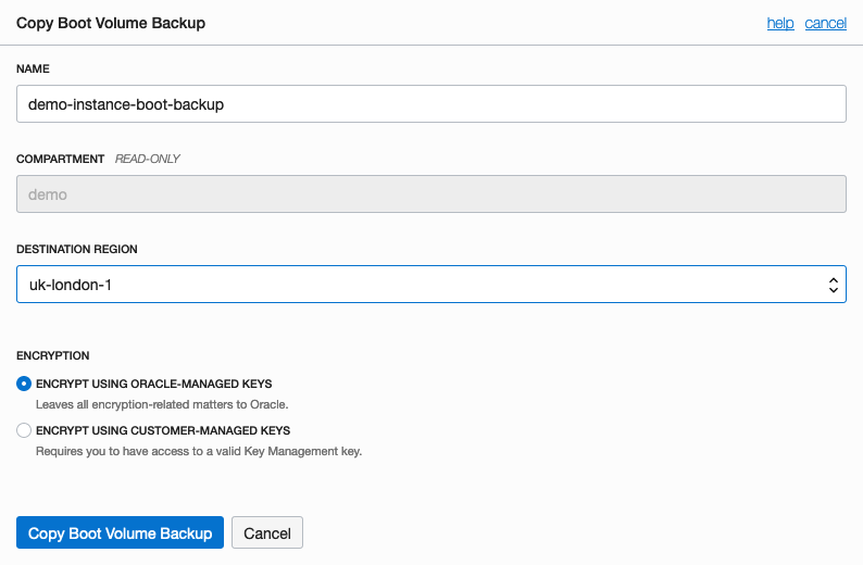 2. Specify a name for the backup and the destination region, and click Copy Boot Volume Backup.
