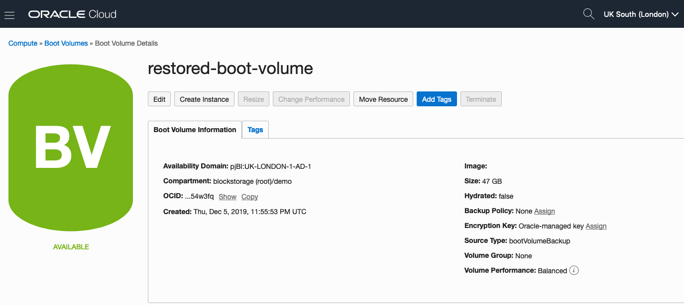 7. In the Boot Volumes section on the destination region, verify that the restored boot volume is available.
