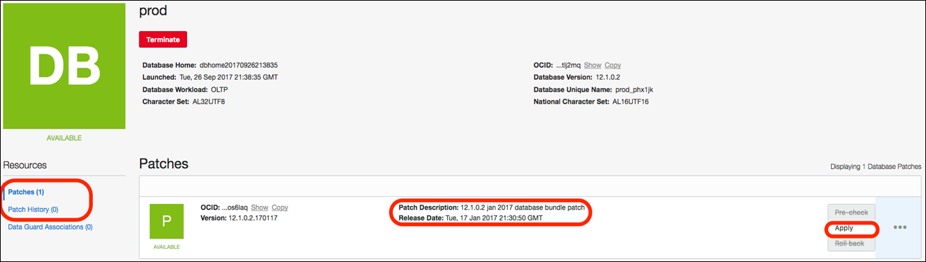 Login to the console, select the database you want to patch and click on “Patches” under Resources. An Oracle Cloud Infrastructure database patch applicable to your database is displayed. Click the actions icon (“…“), and then click on “Apply”.