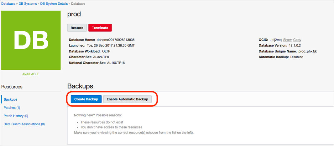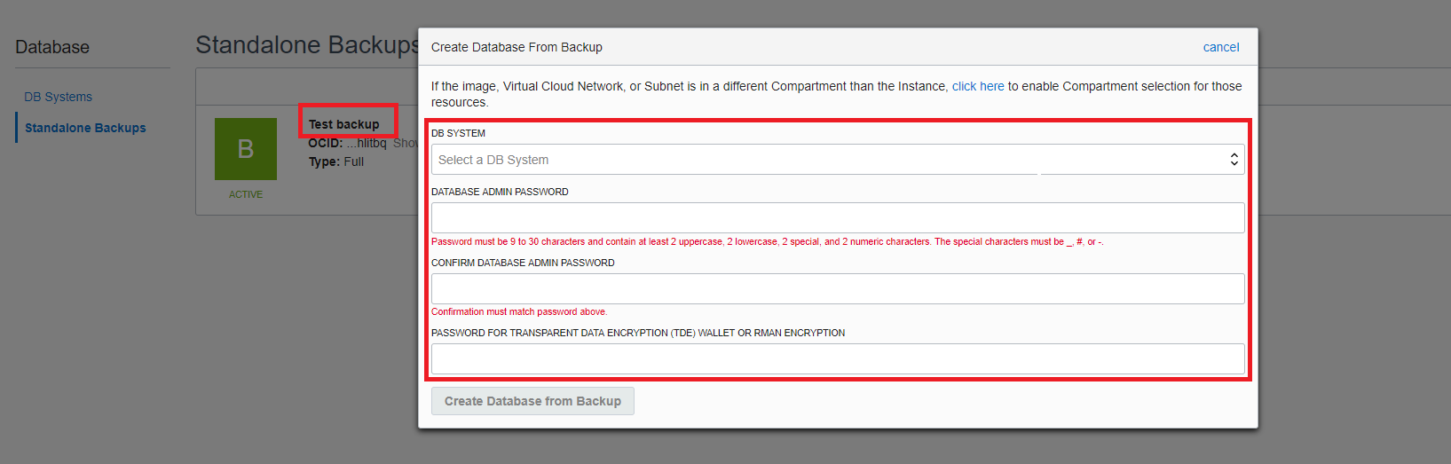 On the main Database landing page, click on “Standalone Backups”. On this page you can view the on-demand full backups that you created. You can then select one of the standalone backups to create a new database. Select the DB System under which you want to create the database and enter admin and TDE password.