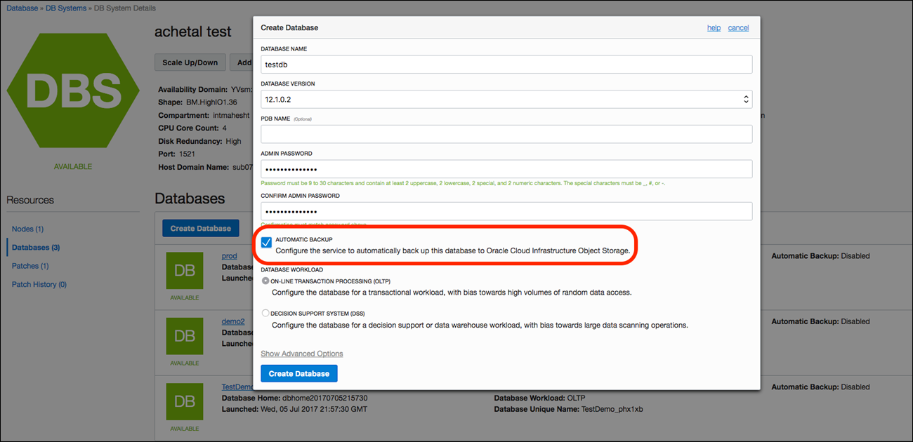 To enable automatic incremental backups, select “Automatic Backup” during database creation. If you select this option, automatic incremental backups will be setup on the database that was created.