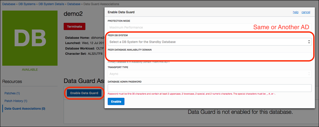 Login to the console, select the database that you want enable Data Guard for and click on “Data Guard Associations” under Resources. An option to enable Data Guard is displayed. Click on “Enable Data Guard” icon, select the “Peer DB System” under which you want to create you standby, enter the standby database password and click on enable “Enable”. A new standby database will be created under the selected Peer DB system and Data Guard association will be established between the primary and standby databases.