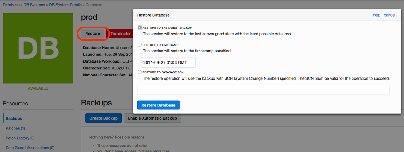 To restore a database from a backup, select the database that you want to restore and select “Restore”. You can restore the database either to the latest, point-in-time or SCN based state.