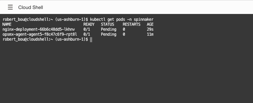 As a final confirmation that the agent has been deployed, you can look at the running pods and see that the OpsMx agent has been deployed.