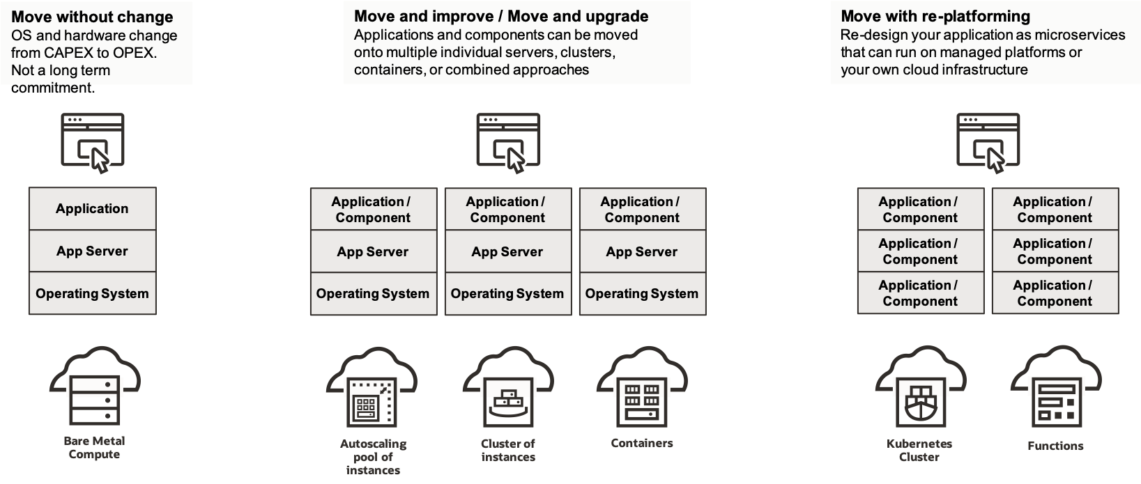 - Move without change – if your infrastructure is already x86_64 based, similar servers can be created, and the application is transferred with virtually no changes.