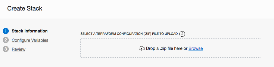 5. On the Stack Information page, upload the zip file that you downloaded in step 1 by browsing for it or dragging it directly to the page. Then, click Next.