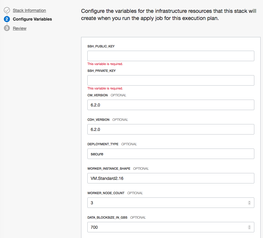 6. On the Configure Variables page, enter the contents of an SSH public-private key pair.