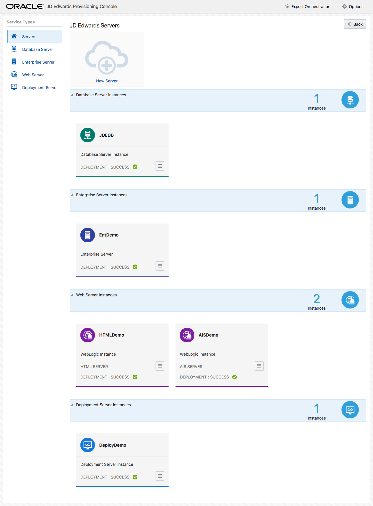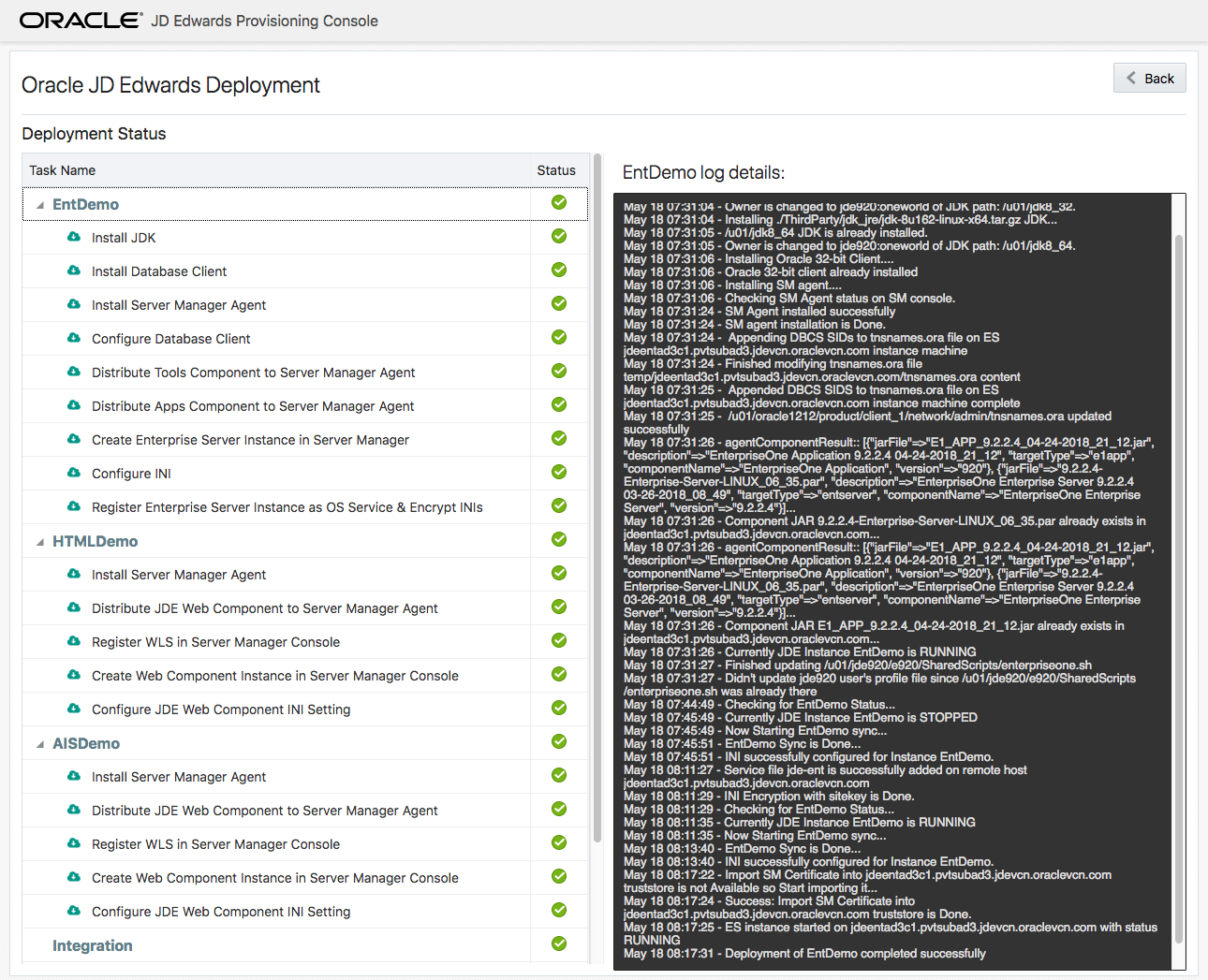 When the orchestration step is complete, click the Deploy box to begin the installation. This step completes the installation and configuration of the JD Edwards environment from start to finish without any further interaction. Allow a few hours for the deployment to complete. In the meantime, monitor the progress on the Deployment Status screen.