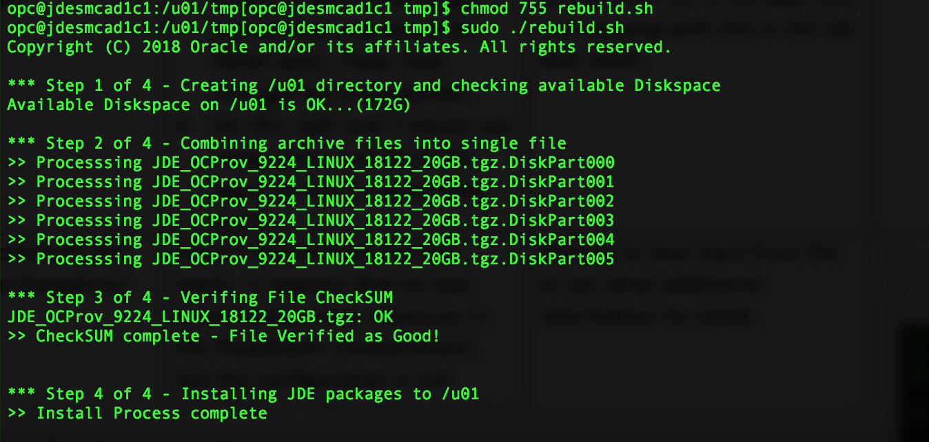 After the parts are downloaded, copy them to the Server Manager Console host and unzip them. This action expands the zip files into the DiskPart files that need to be reassembled, a checksum file, and a reassembly script. Ensure that the rebuild script is executable and then run the script. The script performs the following actions: