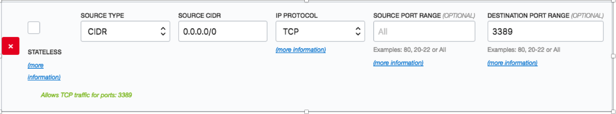 2. In addition to the existing ingress stateful security rules, you may need to add the additional ingress security rules to allow the RDP (Remote Desktop) access to the Windows server. The following screenshot shows the security rule added to the list to allow RDP access.