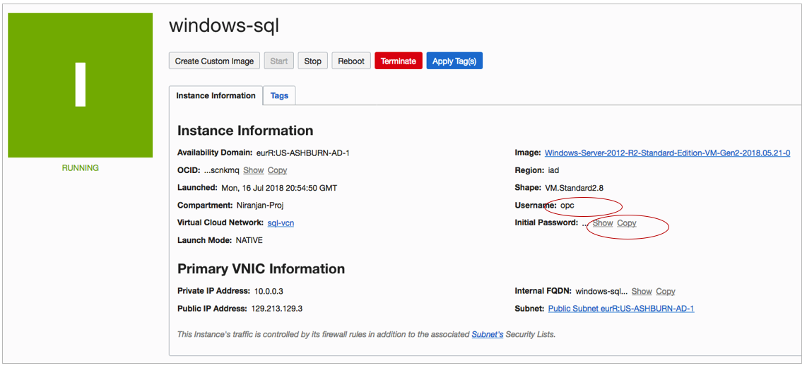 3. Once the Windows server is provisioned, you see the following screen, which shows the username and initial temporary password. Log in to the Windows server with the username “opc” and the initial temporary password through remote desktop. Change the password after you first access Windows server.