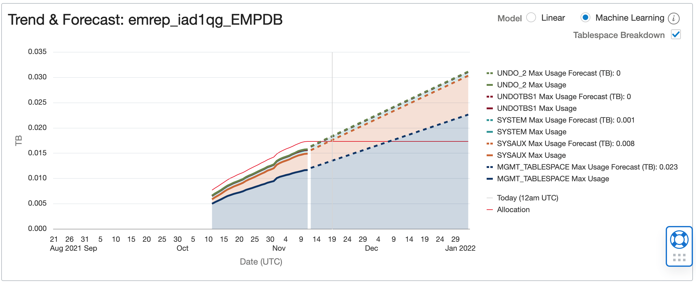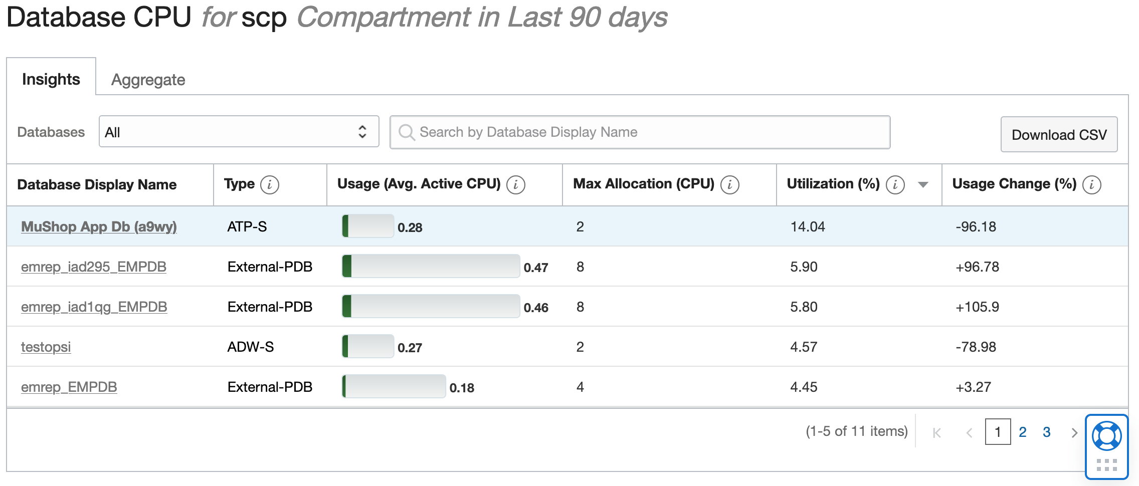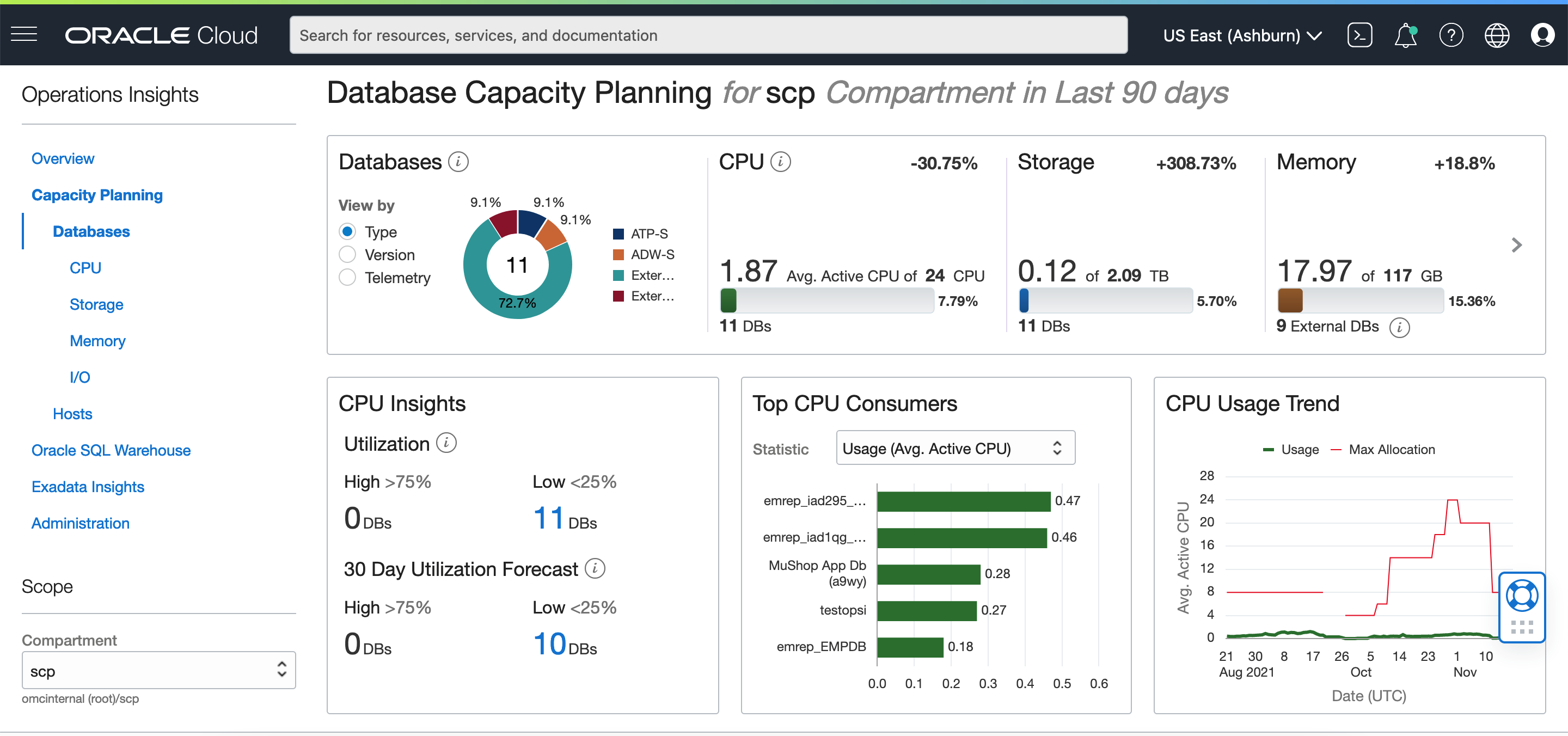 Operations Insights Capacity Planning functionality provides insight into resource and usage of the databases, thus allowing you to meet both peak and long-term database capacity for the organization.