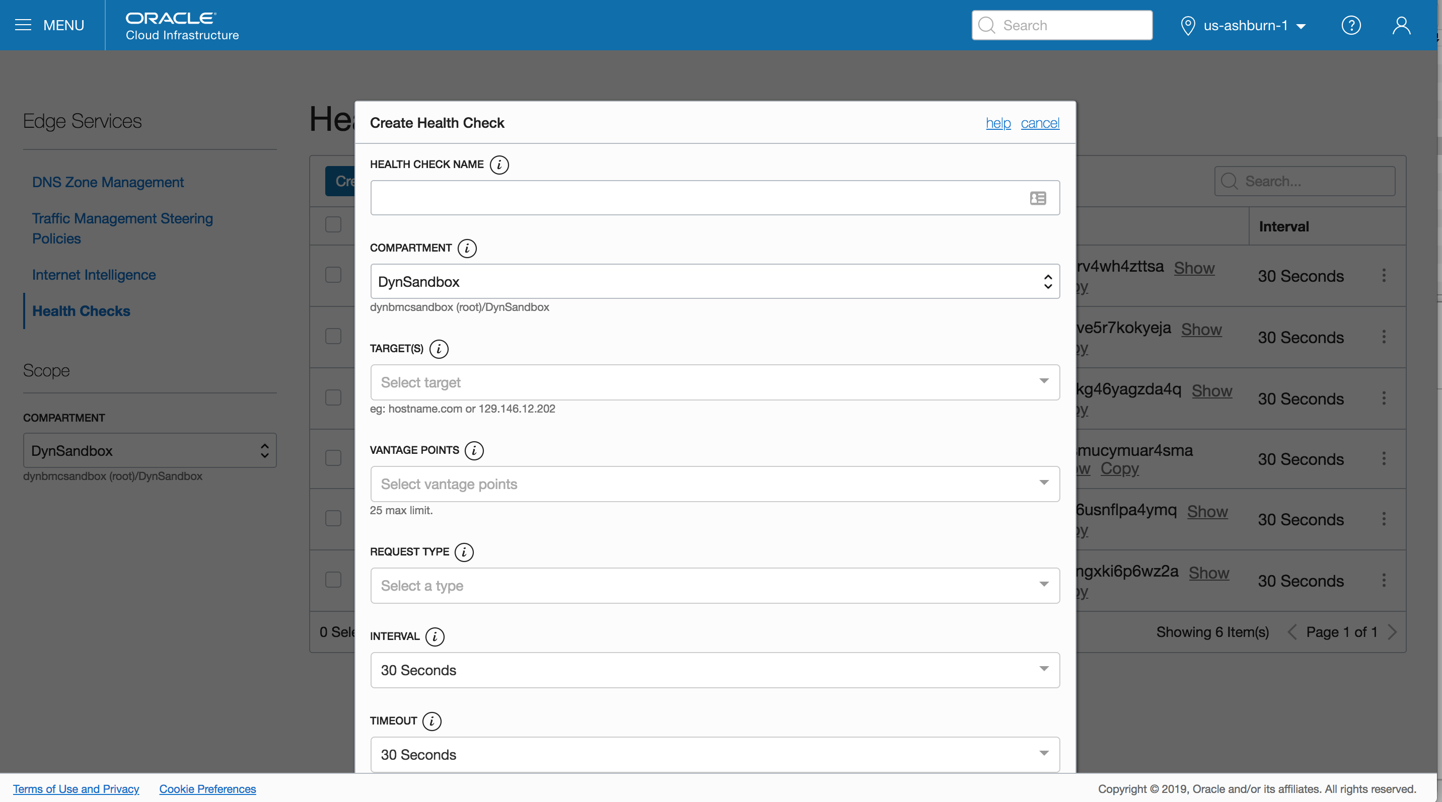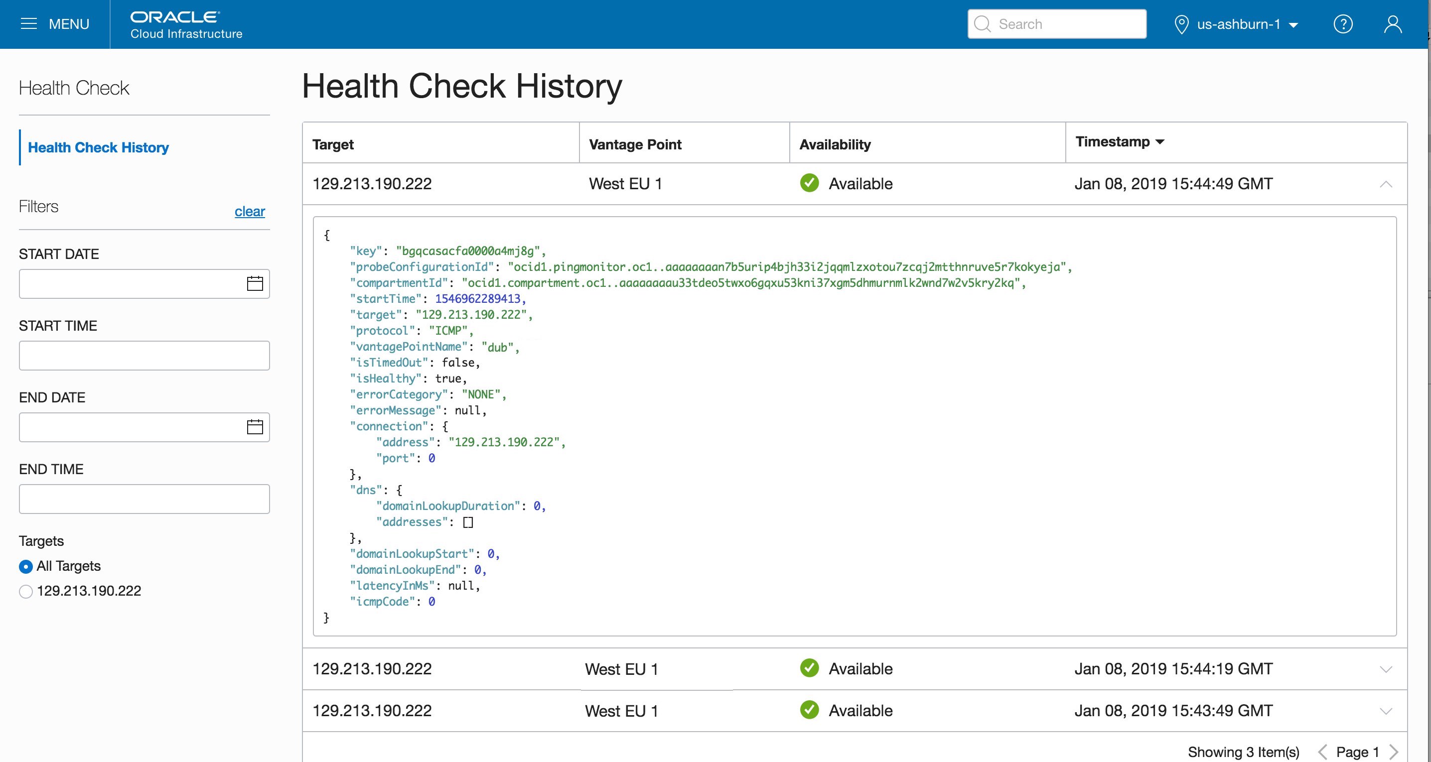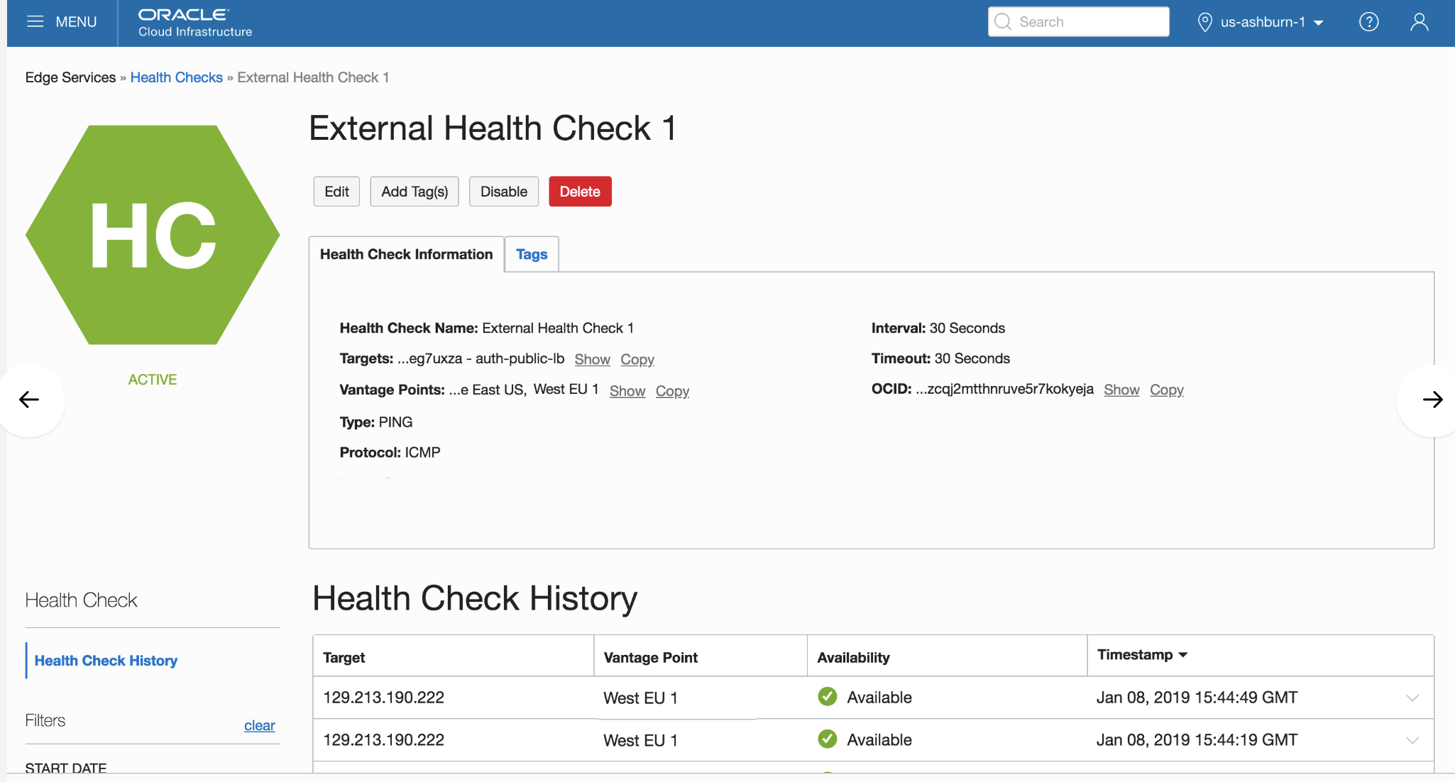 Health checks are simple to configure through a flexible UI or REST API. We recommend using the service to monitor any critical publicly exposed IP address or FQDN that you are delivering, whether hosted solely in Oracle Cloud Infrastructure or across your hybrid environment.