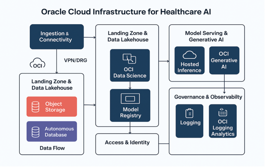 Ingestion & Connectivity: Secure APIs, VPN/DRG (Dynamic Routing Gateway), FastConnect for high-throughput private links to on-premises EHRs or partner systems.
