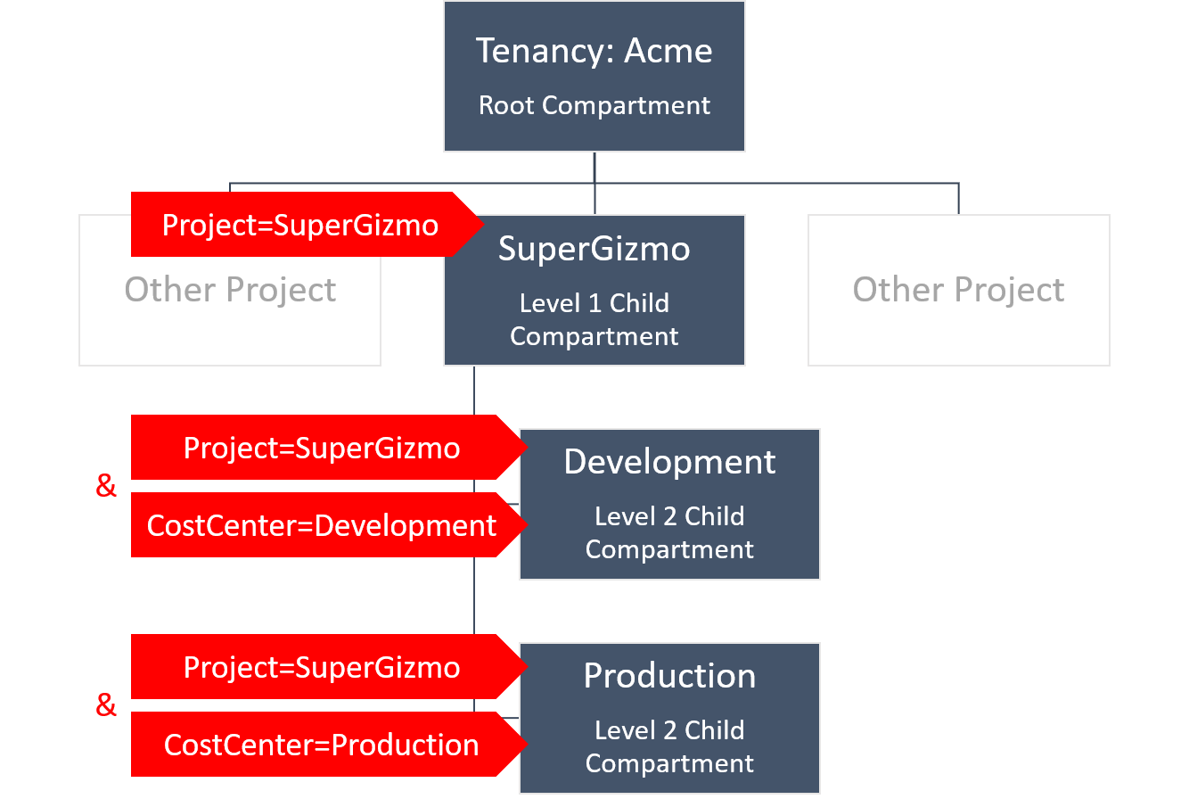 You can inherit tags down your compartment tree so that you can specify tag defaults at every level of your organizational hierarchy. Suppose that the root compartment has a tag default that specifies a set of tags you want to apply to every resource in your tenancy. However, the value of some of those tags depends on which compartment they are in. Using nested compartments and tag defaults, you can allocate costs for even the most complex configurations, from teams and subteams to projects.