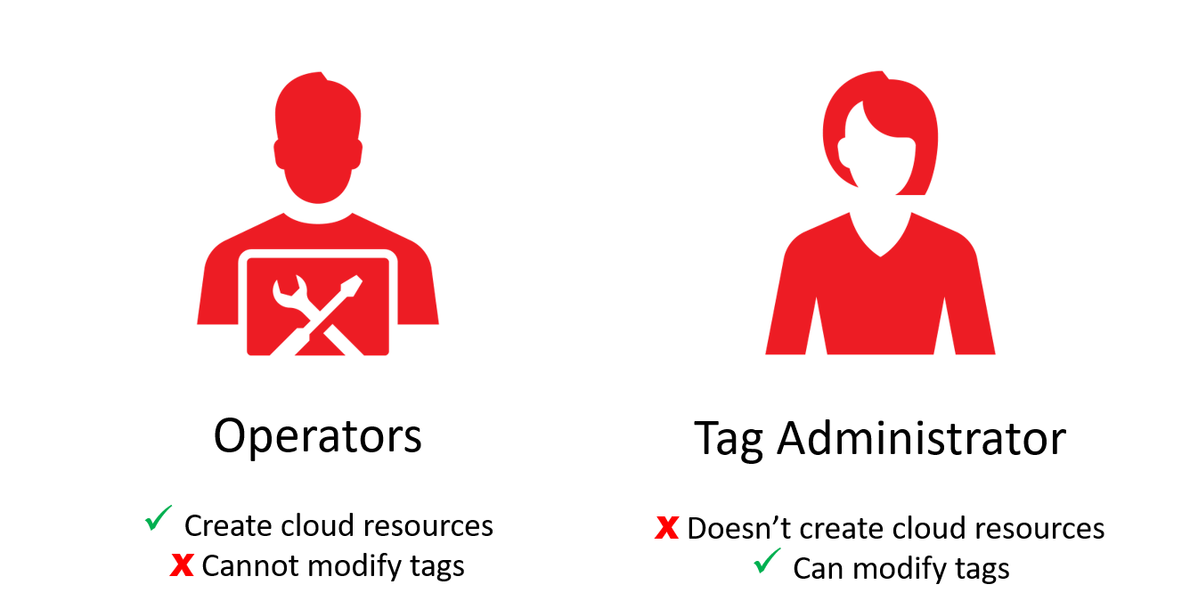 Without tag defaults, the Operators group would create resources, and the Tag_Administrators group, which is allowed to use the CostCenter tag, would have to potentially update all the resources created by the Operators to add the correct tag. This part of the cloud cost management process can be cumbersome, especially if resources are created without tags and might be omitted from the proper cost center until a member of the Tag_Administrators group updates the resources.