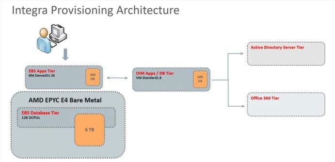 Oracle solution architects and Integra worked closely to define all facets of success criteria. First, Integra provided current architectural details for their older hardware. Engineers then ran AWR miner reports that detailed performance loads during the month or quarter close activities. After analysis, Oracle and Integra decided to structure the P2P with a two-node Exadata Cloud deployment for the database tier and two 36-core bare metal instances for the E-Business Suite application and Concurrency Manager tiers.